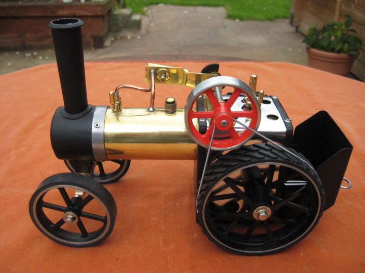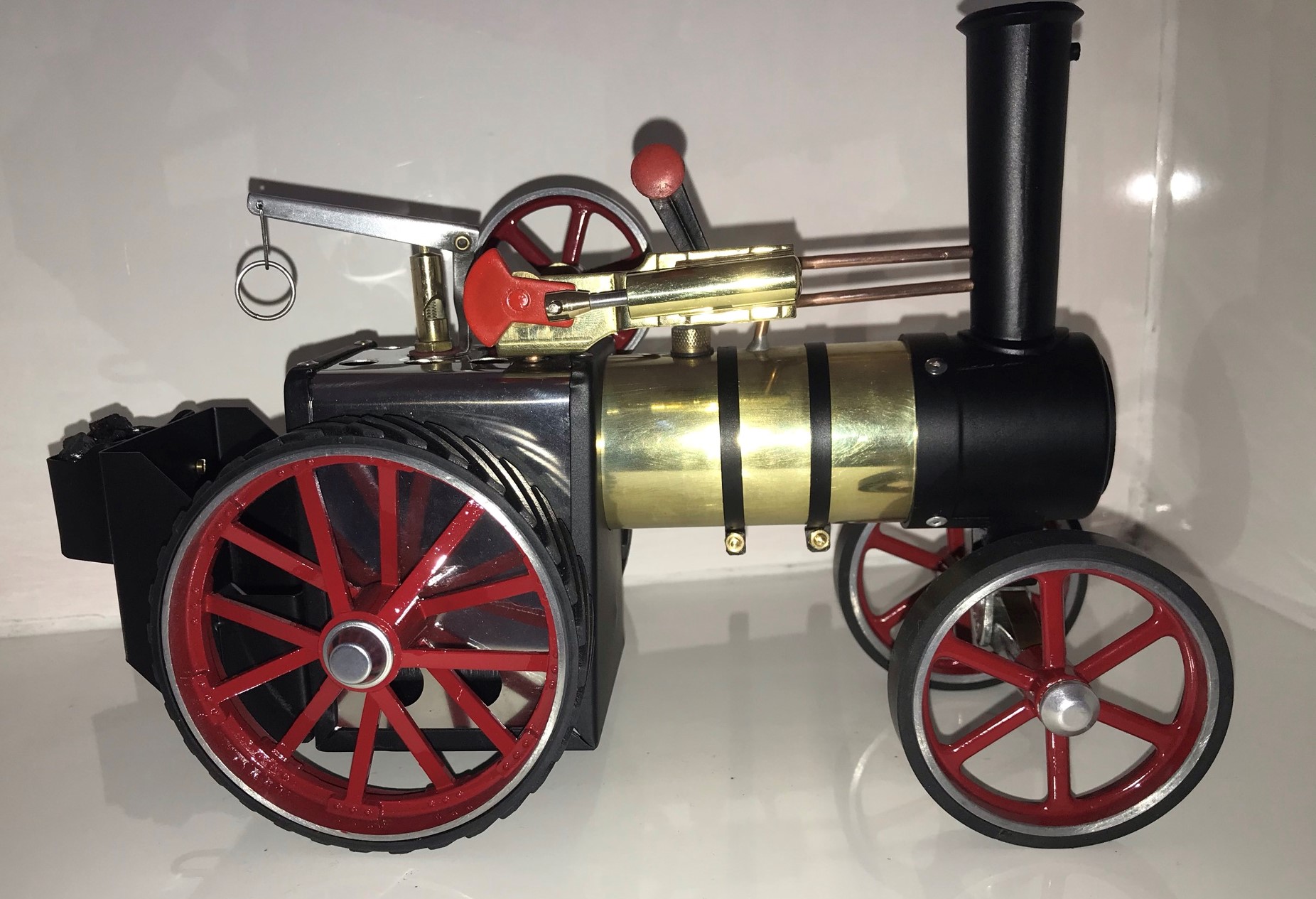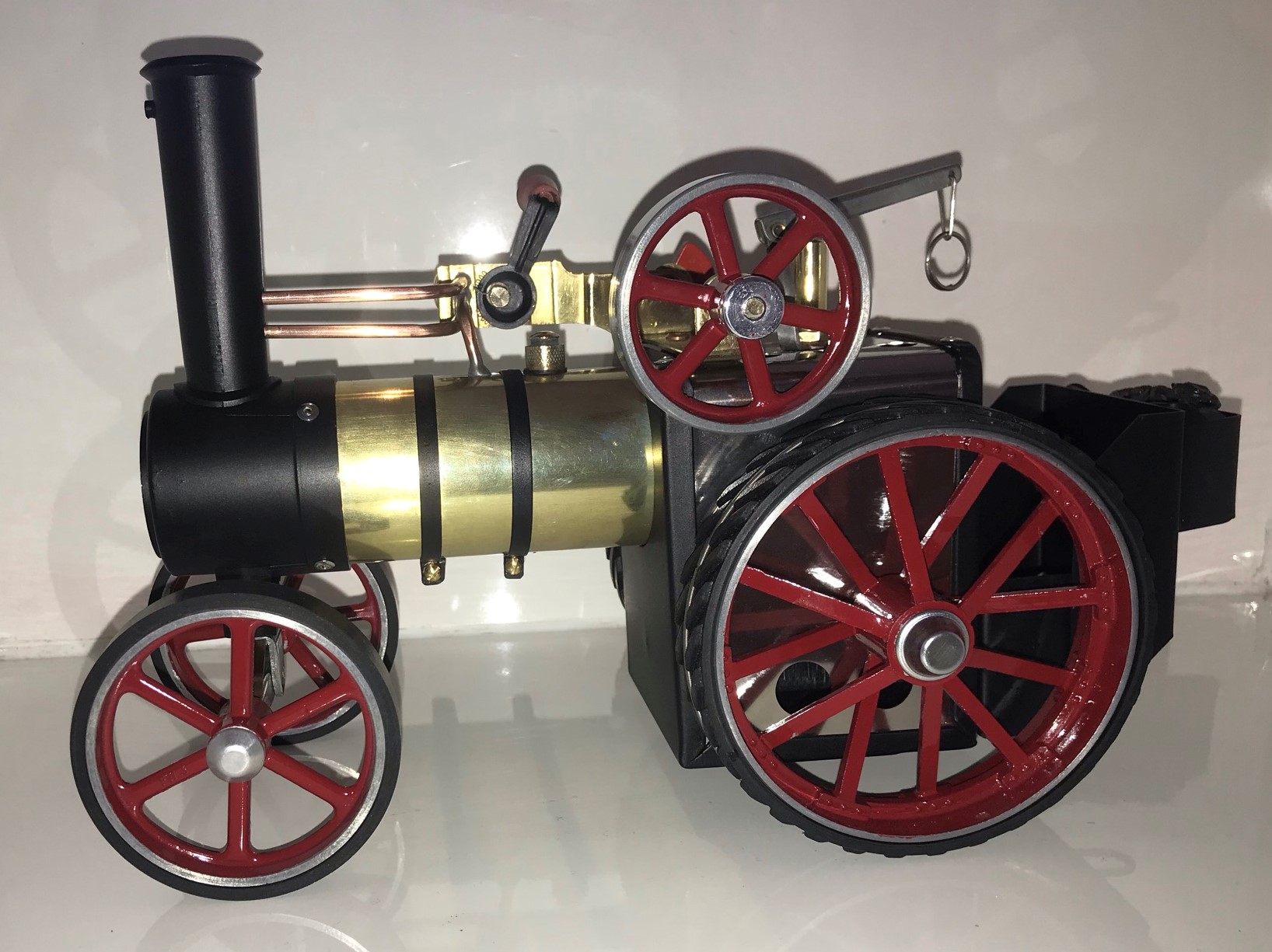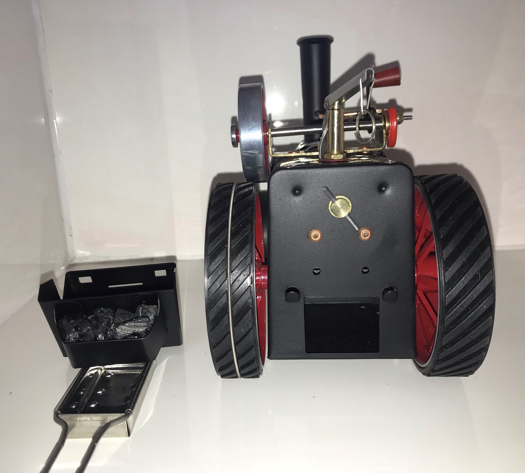 Recently rehomed. Finished with a polished brass boiler set off by matt black and ruby red on stainless steel wheels. Includes coal scuttle and coal.